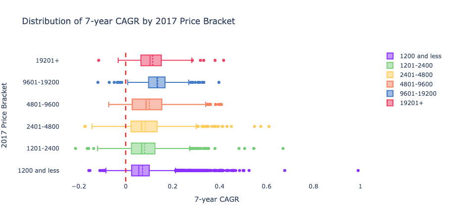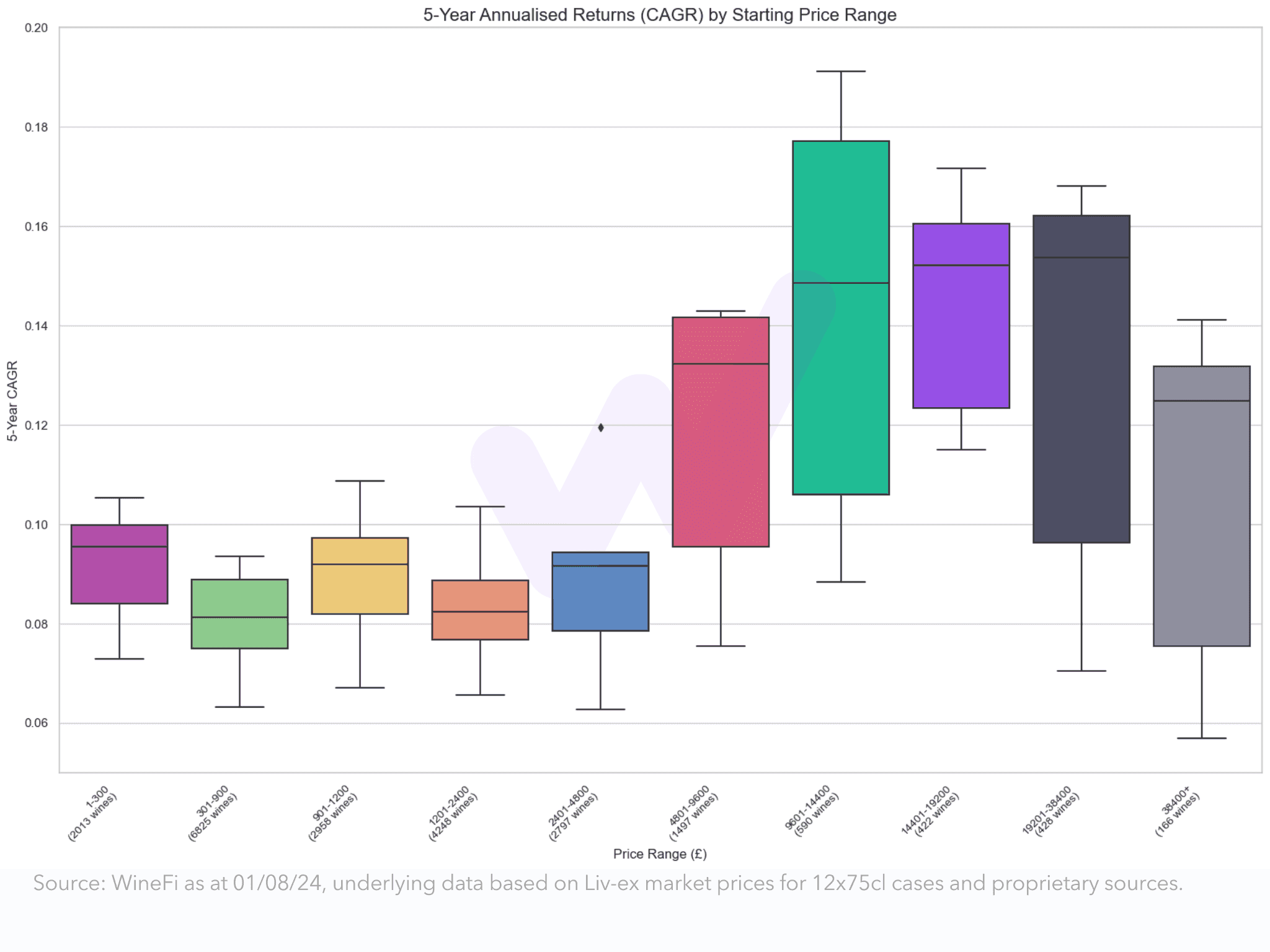Different price ranges represent differing risk profiles. Over the last 7 years, wines below £9,600 (12x75cl case price) had higher proportion of wines averaging CAGR over 25% than those above.