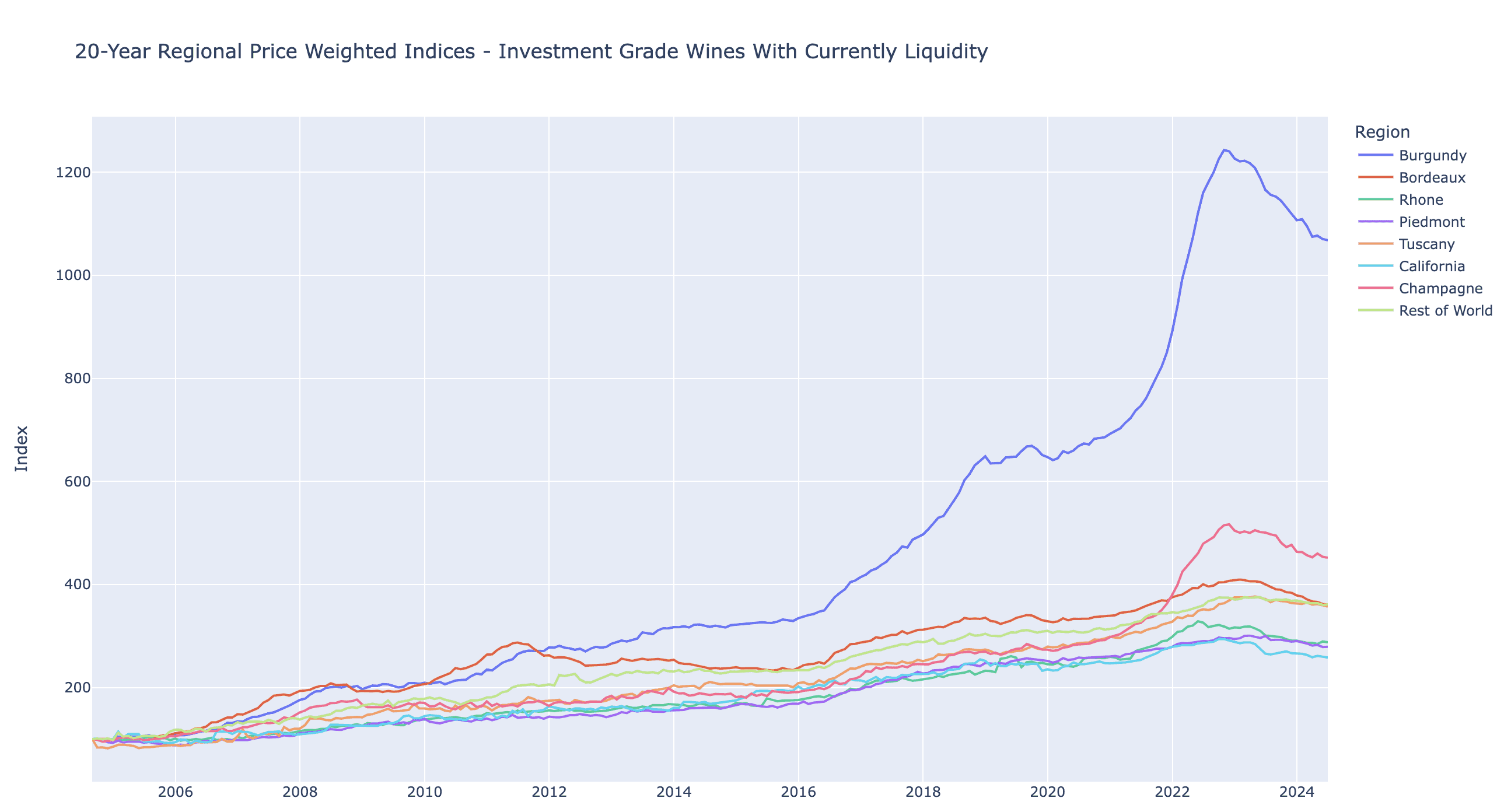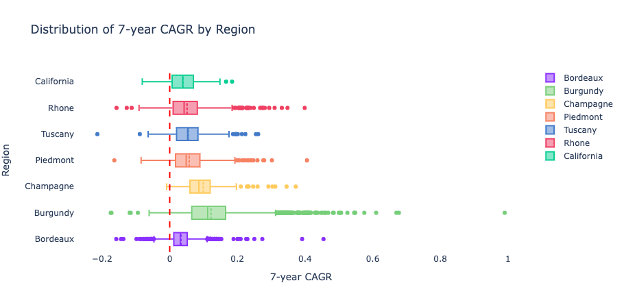 Champagne sits somewhere between Tuscany or Burgundy, with the high average returns closer to Burgundy, but relatively consistent growth over the last 22 years and across wine labels.