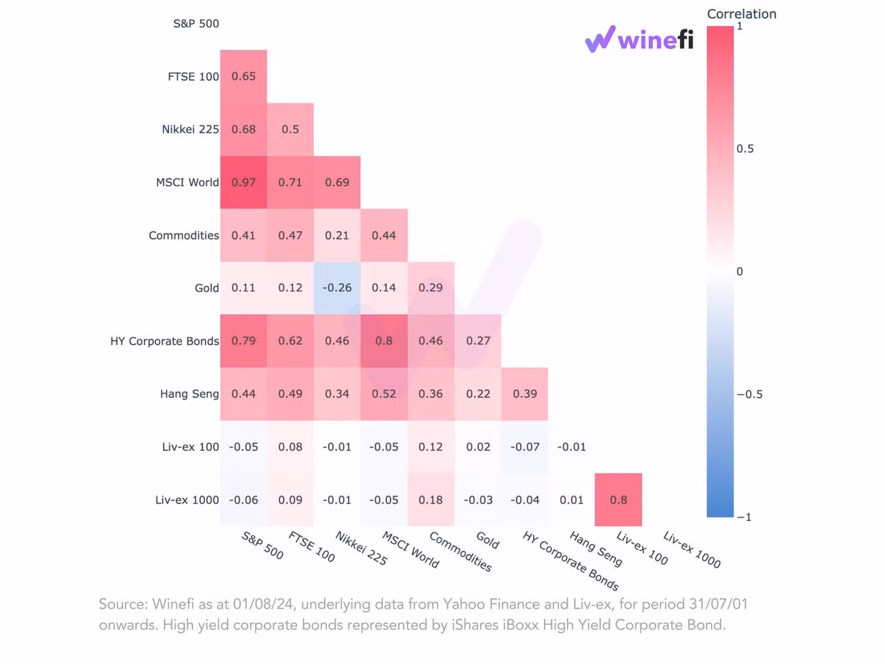 The chart above shows the correlation between the Liv-ex 100 and 1000, regarded as the broadest measure of investment-grade wine, and various other indices and markets.