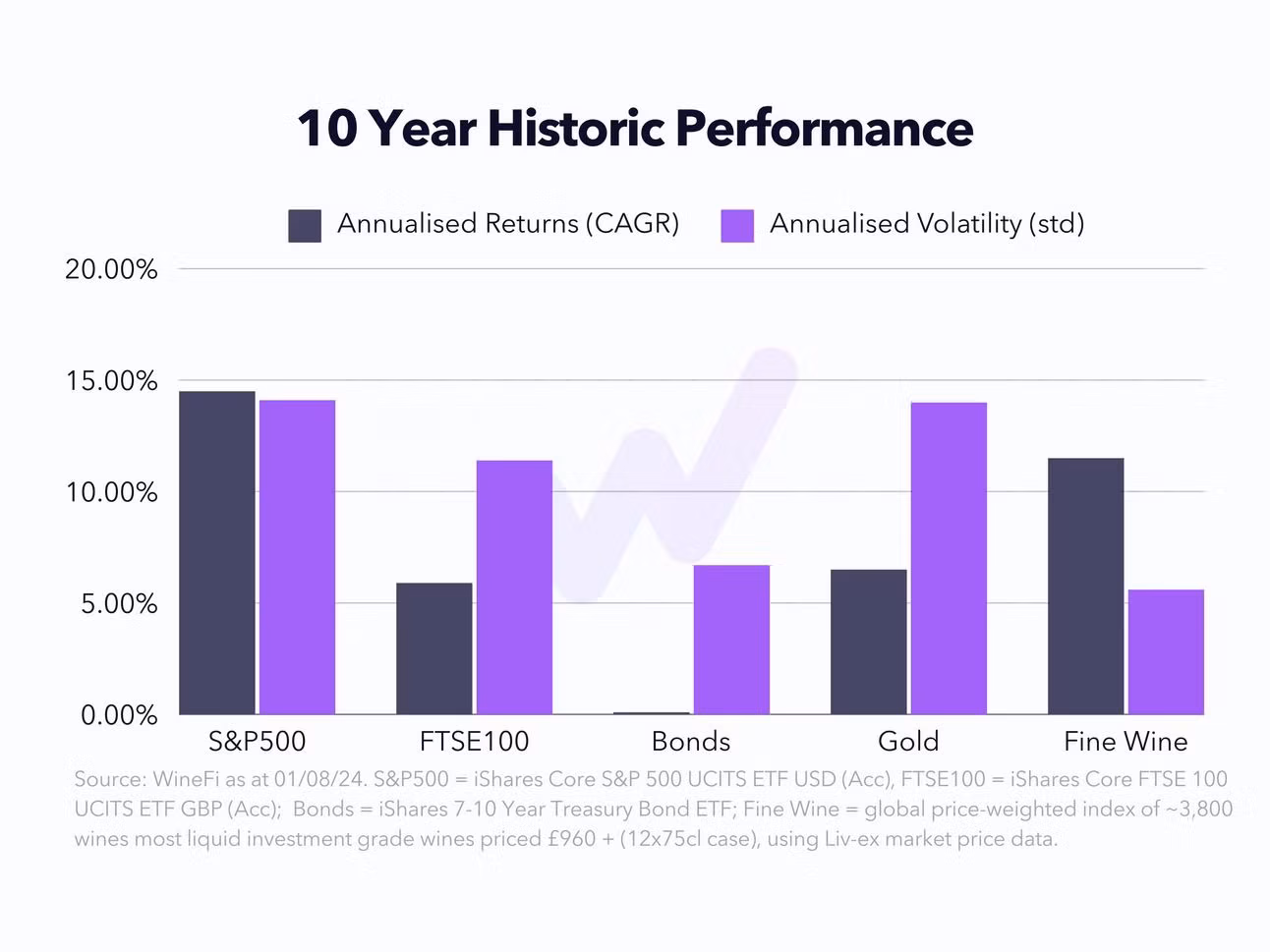 The graph below compares the long term performance of various mainstream asset classes compared to a price-weighted index of ~8000 frequently traded fine wines.