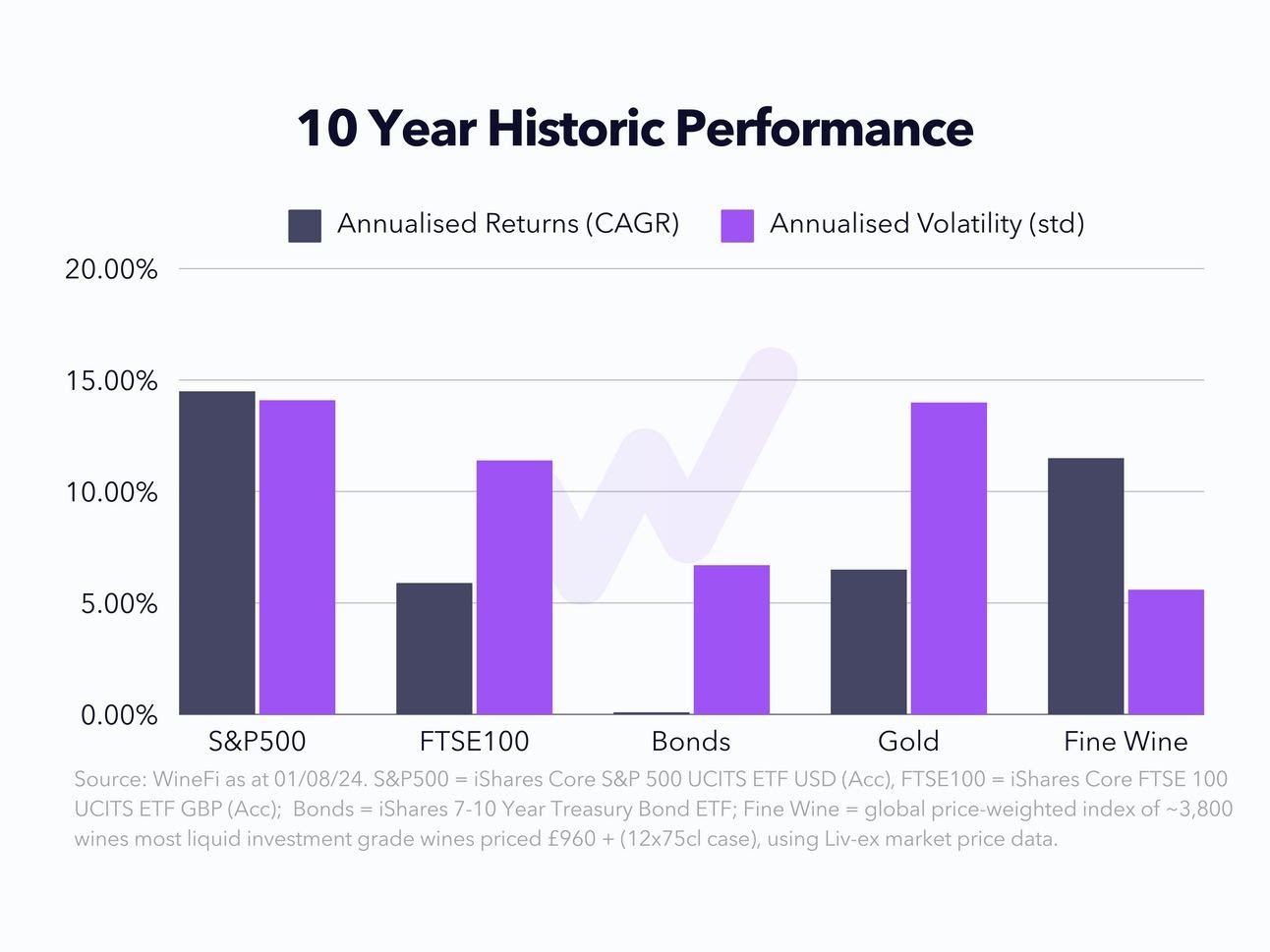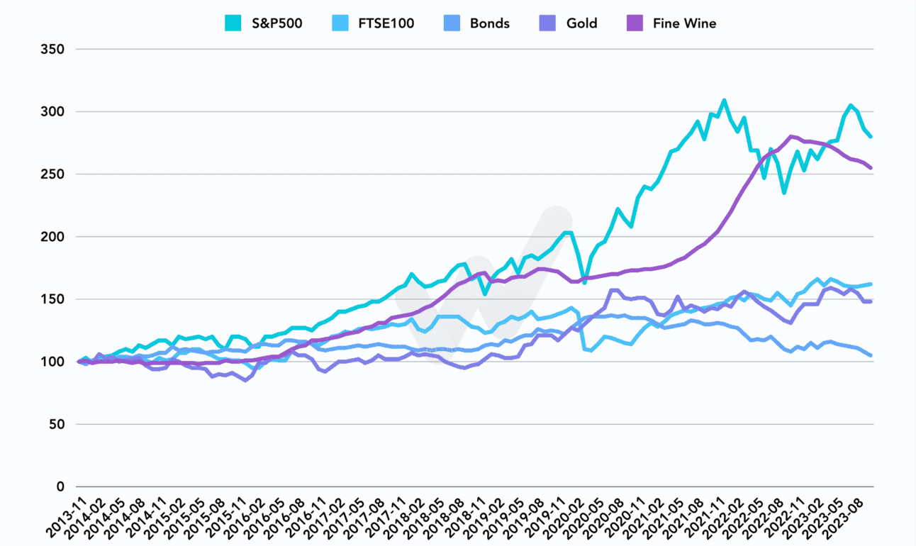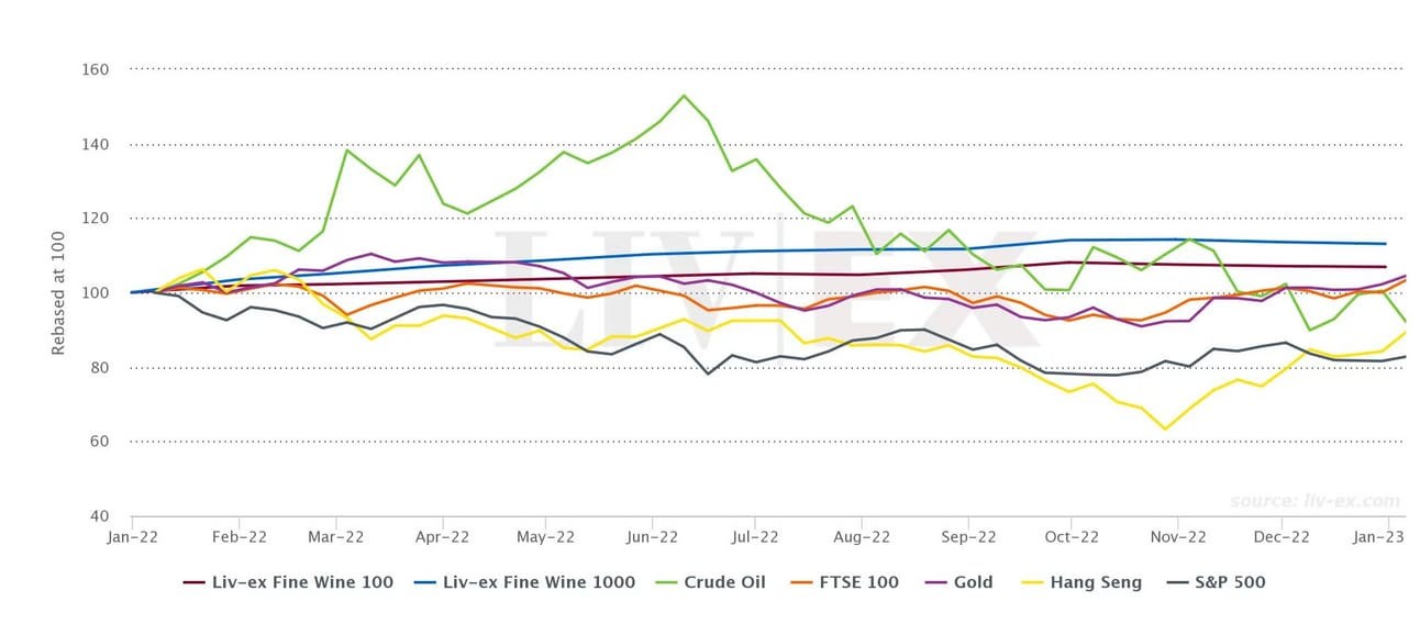 The graph below compares the long term performance of various mainstream asset classes compared to a price-weighted index of ~8000 frequently traded fine wines.