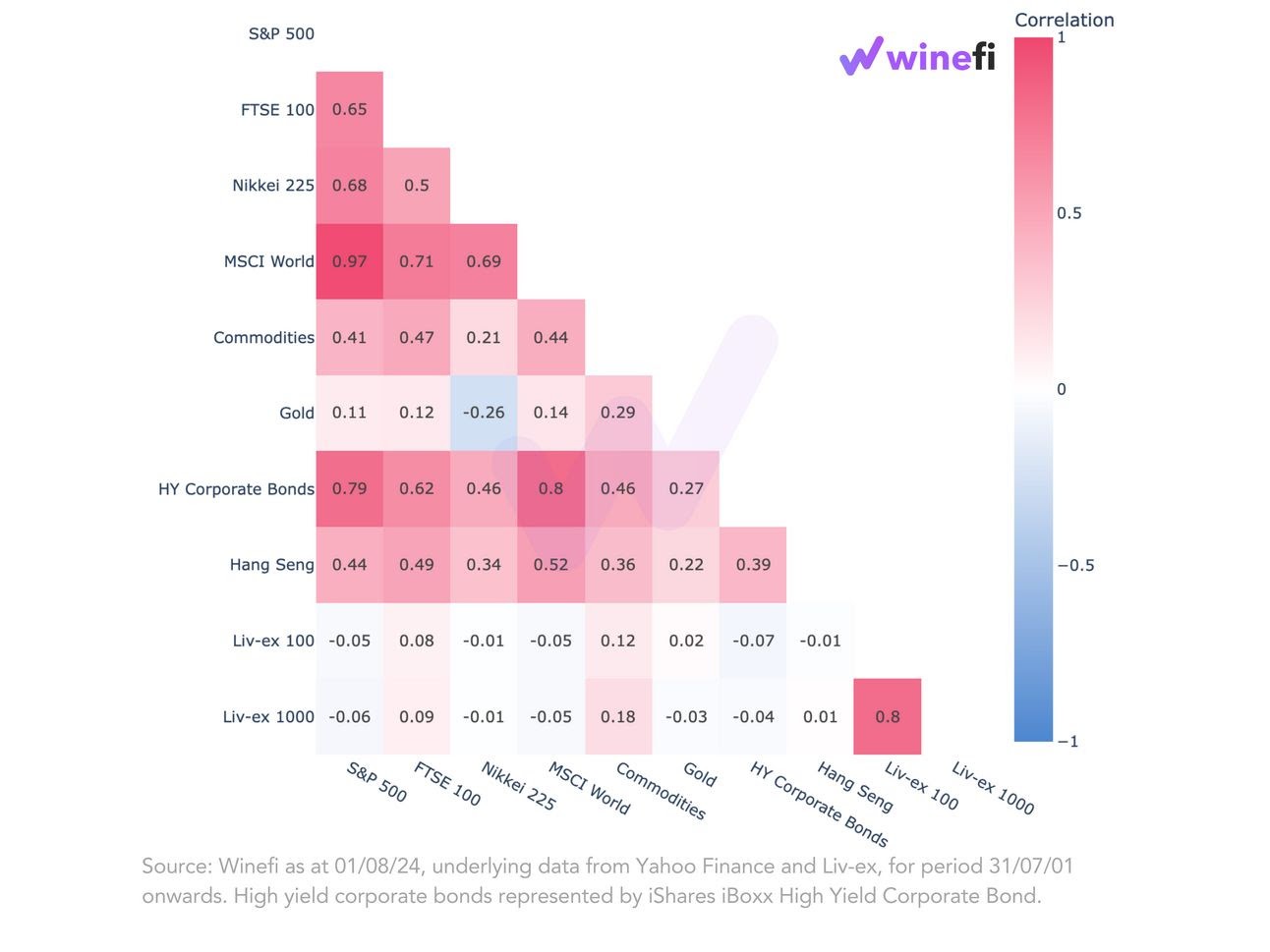The chart above shows the correlation between the Liv-ex 100 and 1000, regarded as the broadest measure of investment-grade wine, and various other indices and markets.
