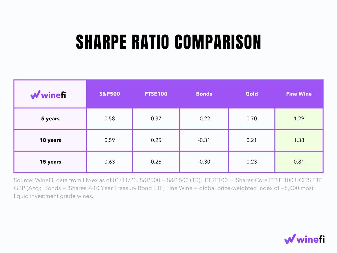 As a result, wine exhibits favourable risk-adjusted returns compared to other asset classes. This is demonstrated by a higher Sharpe Ratio (shown above), which is a measure of the average return of an asset in excess of the risk-free rate and relative to its volatility.